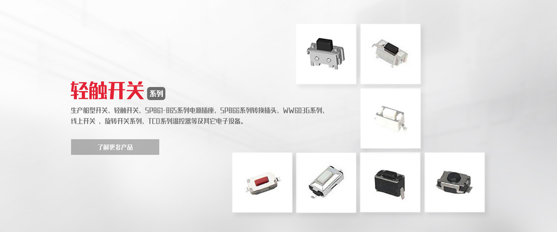 公司專業生產船型開關、輕觸開關、SP861-865系列電源插座、SP866系列轉換插頭、WW11系列微動開關、WW01-03、09系列按鈕開關DS、WW系列指示燈開關、WW603G系列 線上開關 、旋轉開關系列、TCD系列溫控器等及其它電子設備。